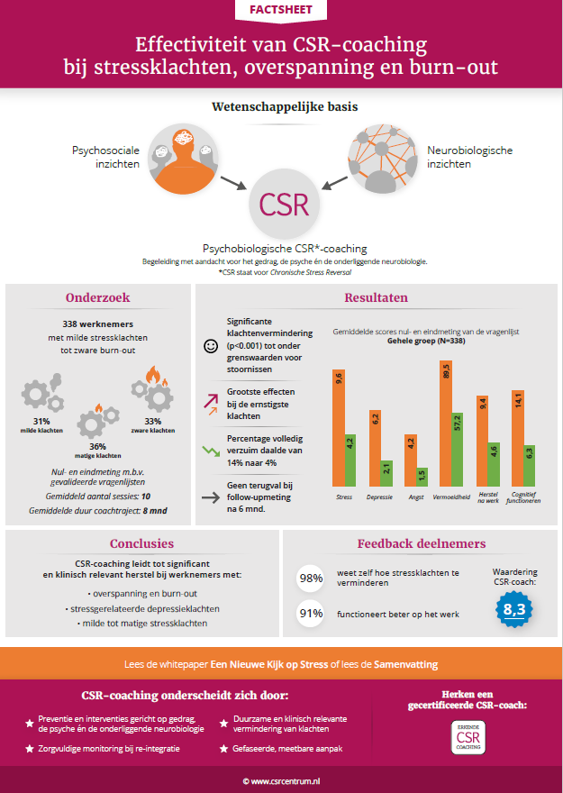 De CSR-methode is een psychobiologische aanpak voor stressklachten en burn-out met begeleiding op drie niveaus: lichaam, psyche en gedrag. Uit onderzoek blijkt dat deze aanpak effectief is voor o.a. herstel van stressklachten.